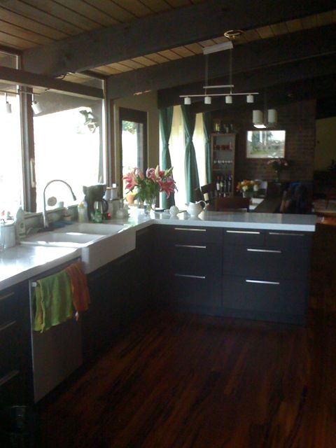 Facing the dining room. Lighting has been replaced, counters installed, new kitchen sink... life is good. Those are my Mother's Day lilies from G on the counter...