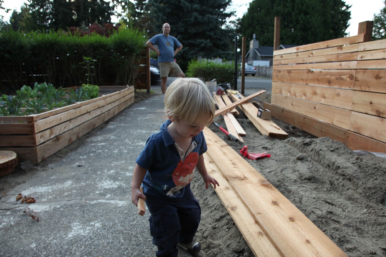 O really wanted to help. Hammering. Holding nails. Cutting boards.